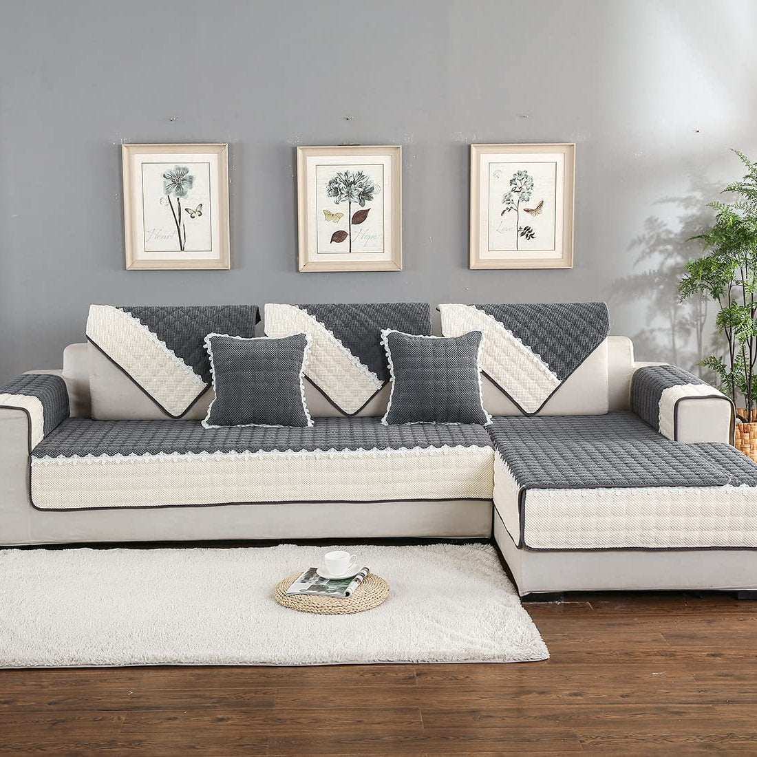 Protect your furniture with this stylish, non-slip sofa mat for a modern touch to your sofa. Made with corduroy fabrics and lace, this furniture protector is perfect for dogs, pets, and kids. Enjoy your couch looking like new!